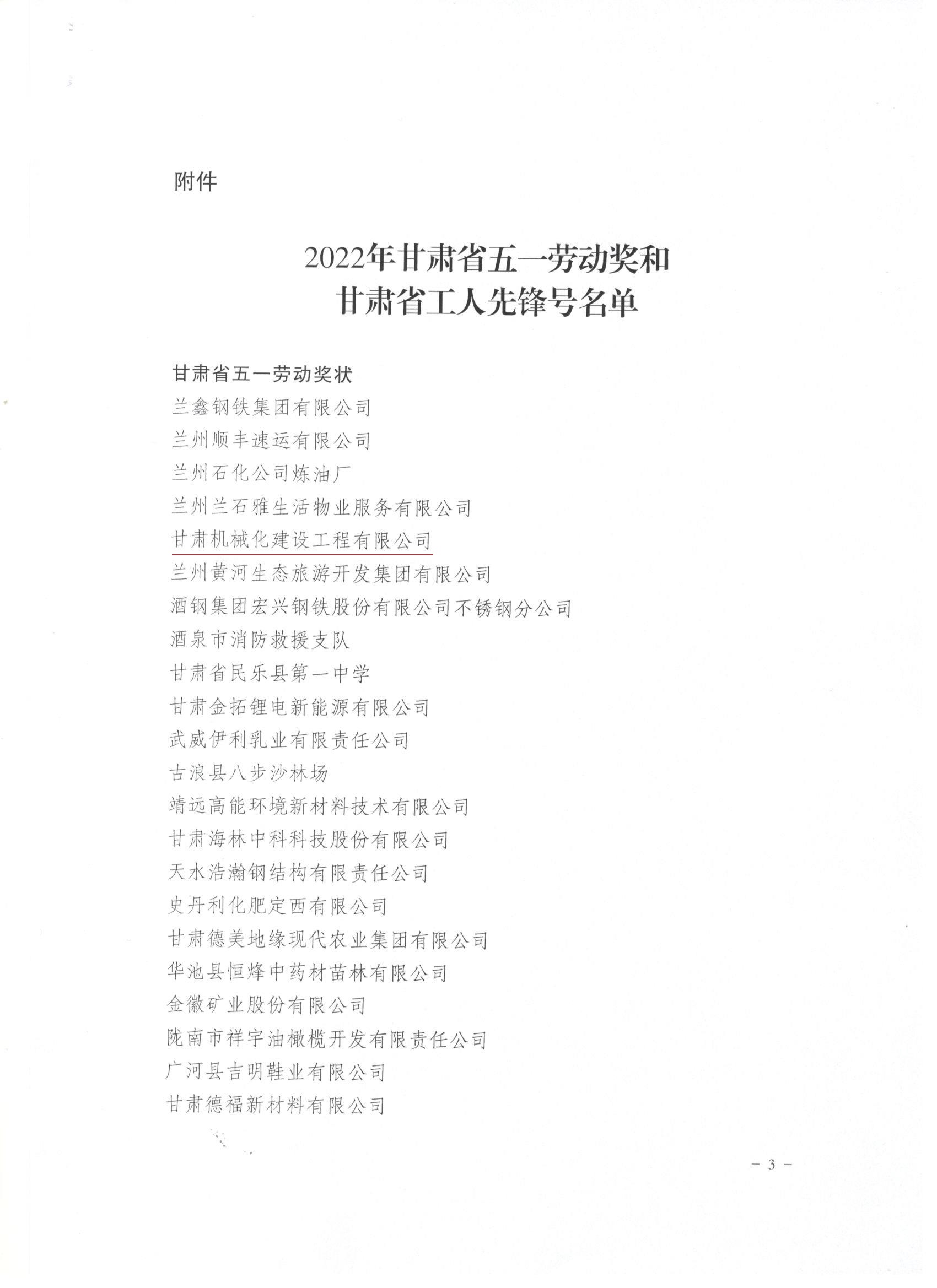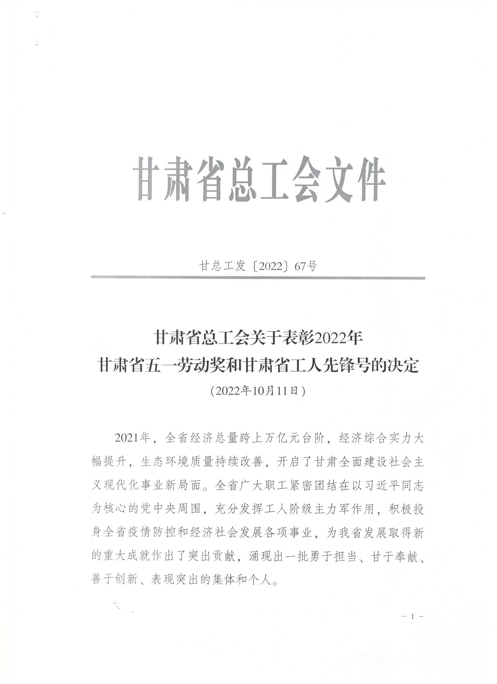 近日,甘肅省總工會發(fā)布了《關(guān)于表彰2022年甘肅省五一勞動獎和甘肅省工人先鋒號的決定》,我司被授予“甘肅省五一勞動獎”和“甘肅省工人先鋒號”。