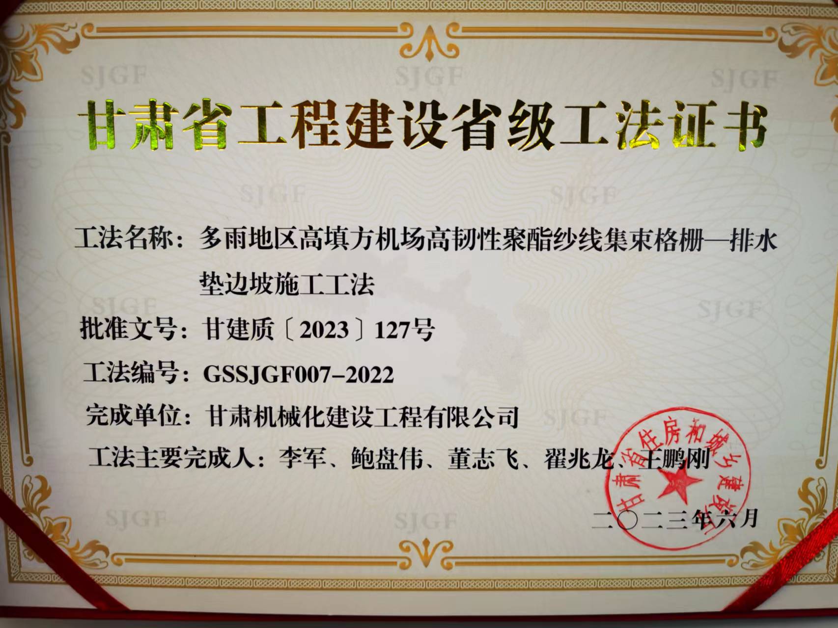 近年來,我司不斷加強技術(shù)創(chuàng)新和精品工程創(chuàng)建,科技創(chuàng)新能力和工藝水平再上新臺階。在承建的麗水機場土石方工程02標段中,面對多雨地區(qū)高填方施工中的重難點,公司專門組建了科研和施工小組,通過大量現(xiàn)場工藝實踐、工藝改善,提煉出項目重難點的關(guān)鍵技術(shù)。2023年6月,獲得了“多雨地區(qū)高填方機場高韌性聚酯紗線集束格柵—排水墊邊坡施工工法”。